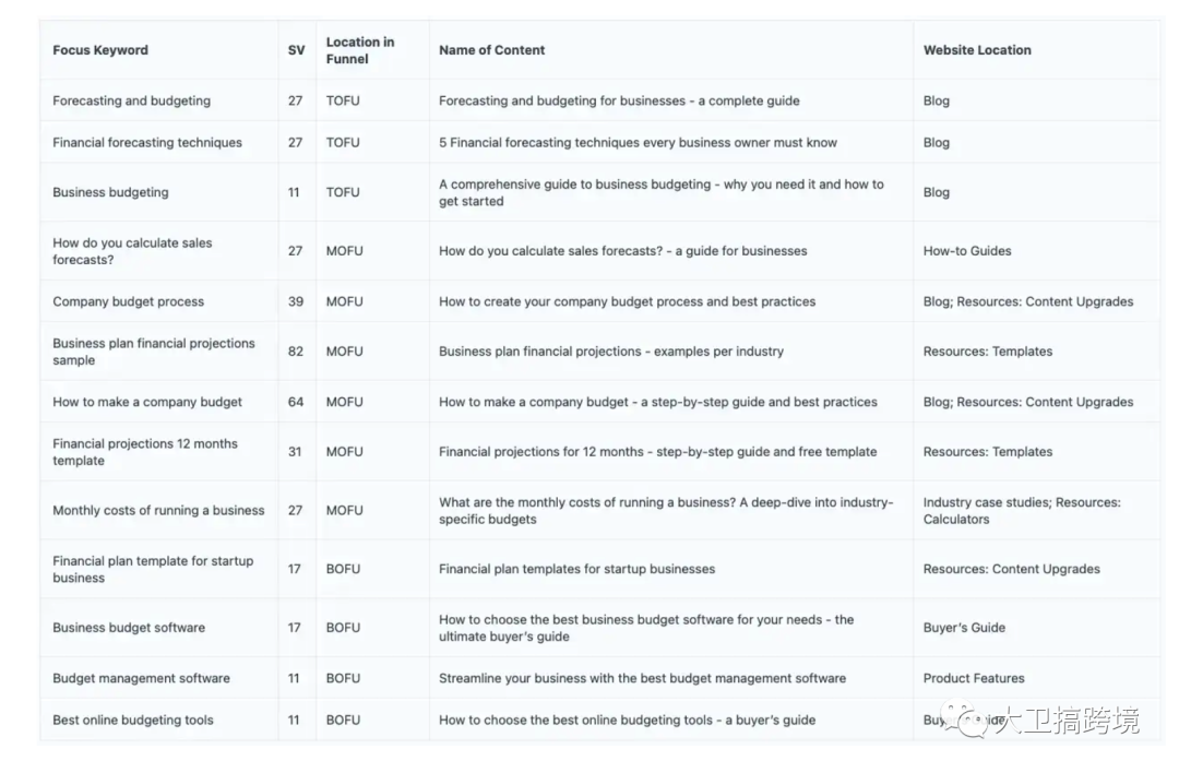从左到右是关键词,搜索量,buy journey(TOFU就是top of funnel,MOFU就是middle of funnel),关键词要写的文章主题,关键词分布的页面位置。