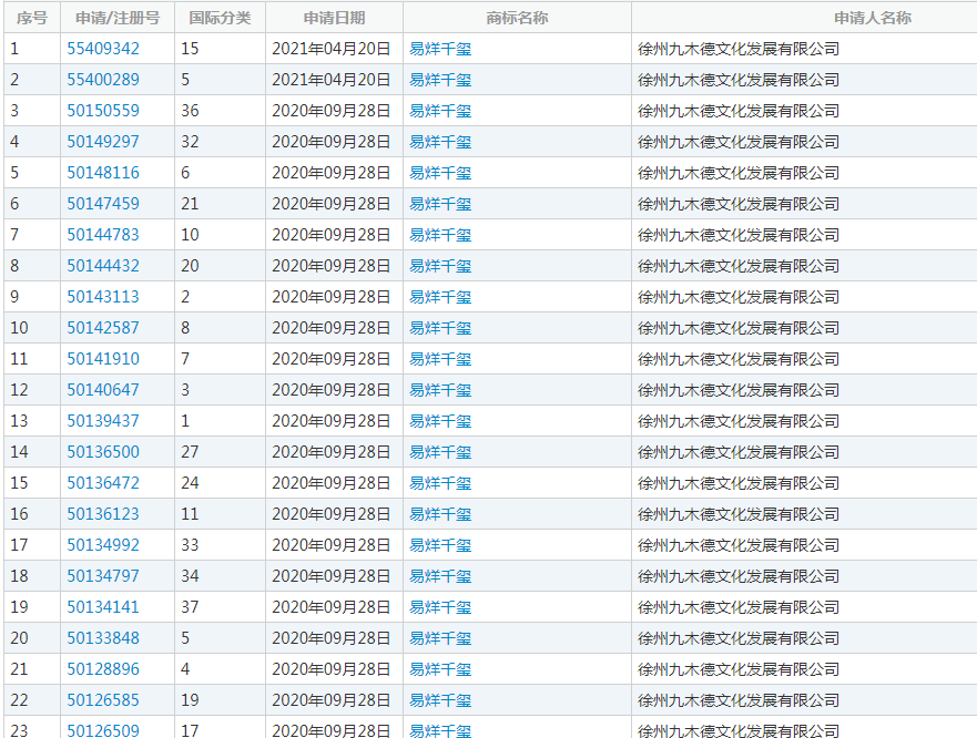 去年9月份,易烊千玺关联公司徐州九木德文化发展有限公司申请的多个"易烊千玺"
