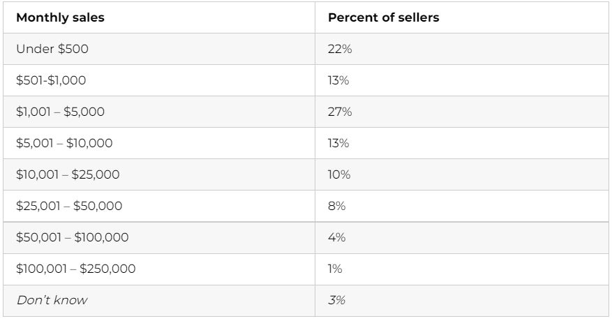 22% 的卖家每月销售额低于 500 美元,3% 的卖家不知道他们的月销售额。