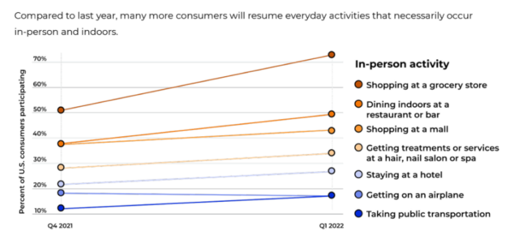 总的来说与去年相比,更多的消费者计划在未来几个月回归各式的线下活动,包括酒店住宿和乘坐飞机出游。2021年的调查中,有54%的消费者计划探亲,50%计划探访朋友;而今年呢,这两个数字都跃升了20%以上。