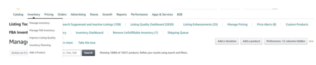 1.进入亚马逊卖家中心,再进入库存管理,然后点击 "添加产品"。