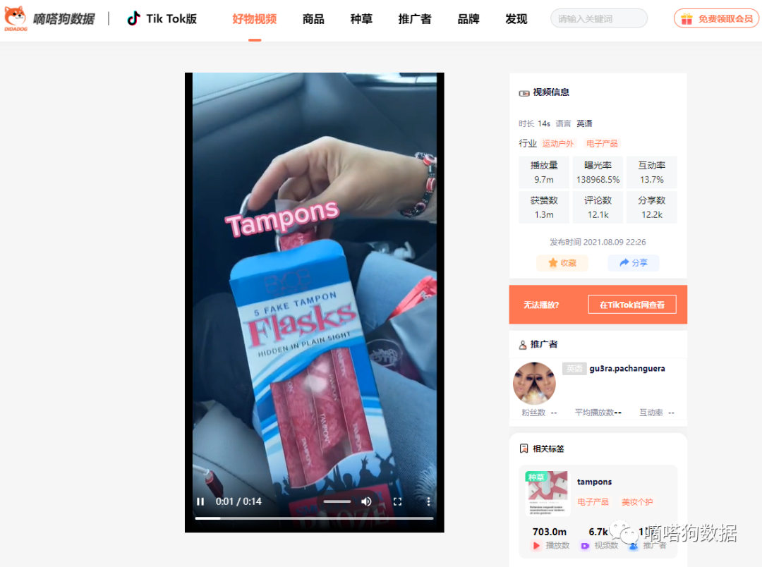 这款卫生棉酒瓶伪装性非常高,基本杜绝了被发现风险,嘀嗒狗发现该产品近期在TikTok热度非常高。