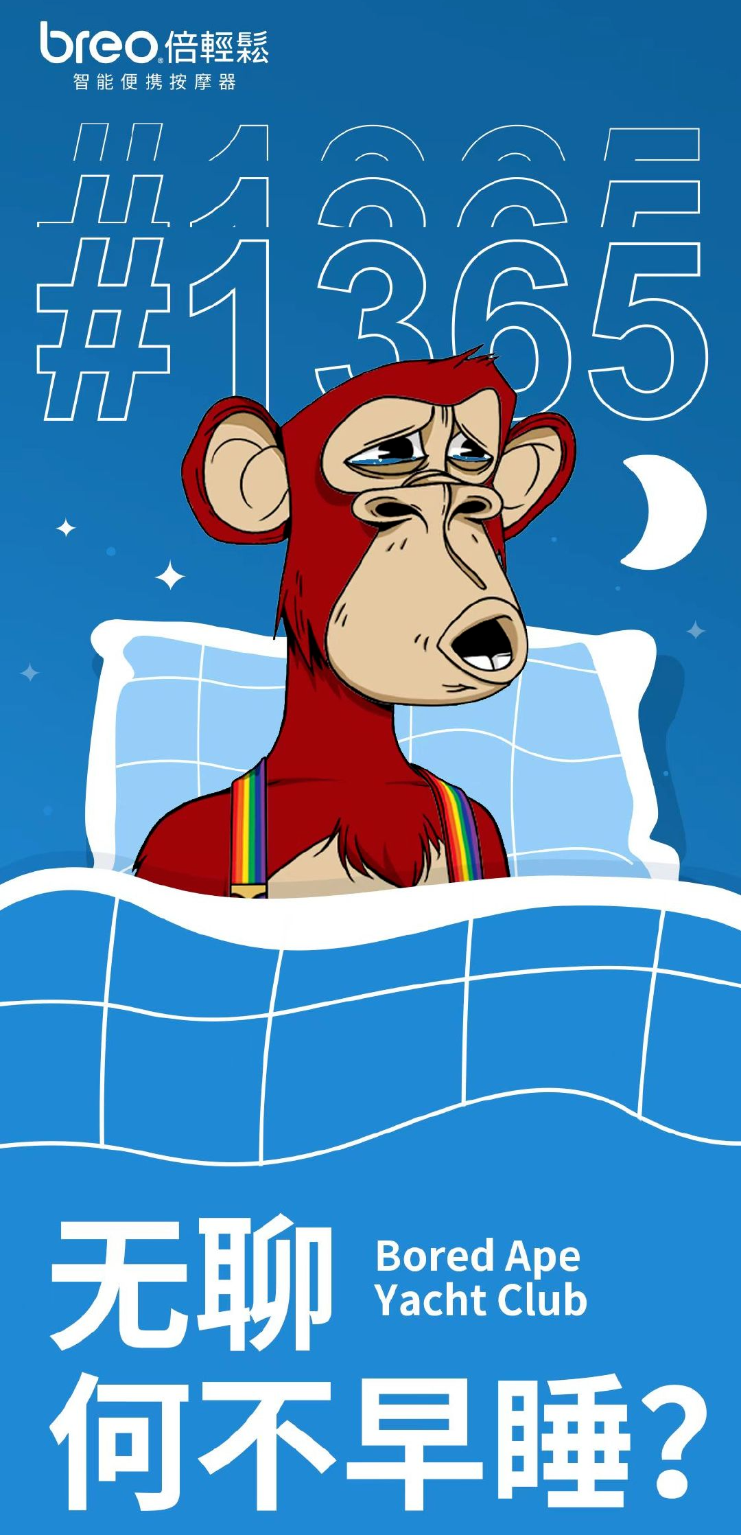 智能按摩器品牌 breo倍轻松 4 月 30 日宣布购入 NFT 顶级 IP BAYC(Bored Ape Yacht Club|无聊猿游艇俱乐部)的 1365 编号成员,并且在其公众号文章中揭示了随之将来的会员福利,包括无聊猿花式早睡头像、潮玩盲盒、限量版早睡按摩仪等,希望借此机会让数字化 NFT 更好的与中医文化融合,赋能智能电子健康消费品。