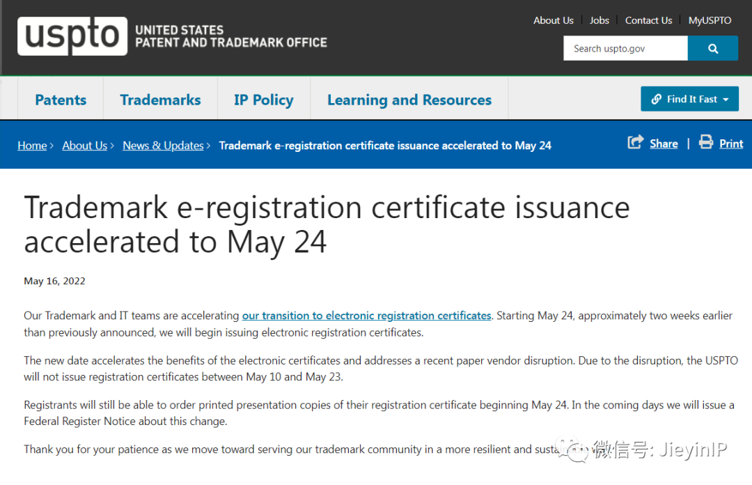 原美国商标专利局定于2022年6月7日开始颁发电子商标注册证书,现新通知颁发电子商标注册证书现加快至5月24日!比之前公布的时间提前2周左右。