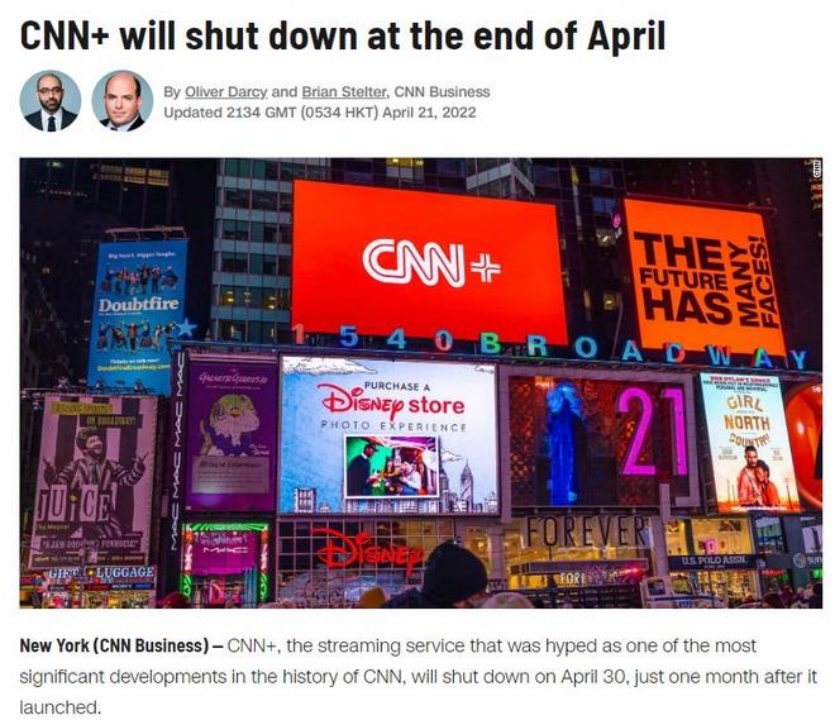 1、新闻巨头押注流媒体遭遇重挫 CNN+上线不到一个月被叫停据CNN报道,新闻流媒体平台CNN+将在4月30日正式关闭,距离其3月29日正式上线才刚刚过去一个月。