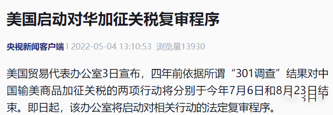 据小编最新获悉:5月3日,美国贸易代表办公室(USTR)宣布,四年前依据所谓"301调查"结果对中国输美商品加征关税的两项行动将分别于今年7月6日和8月23日结束。即日起将启动对相关行动的法定复审程序。