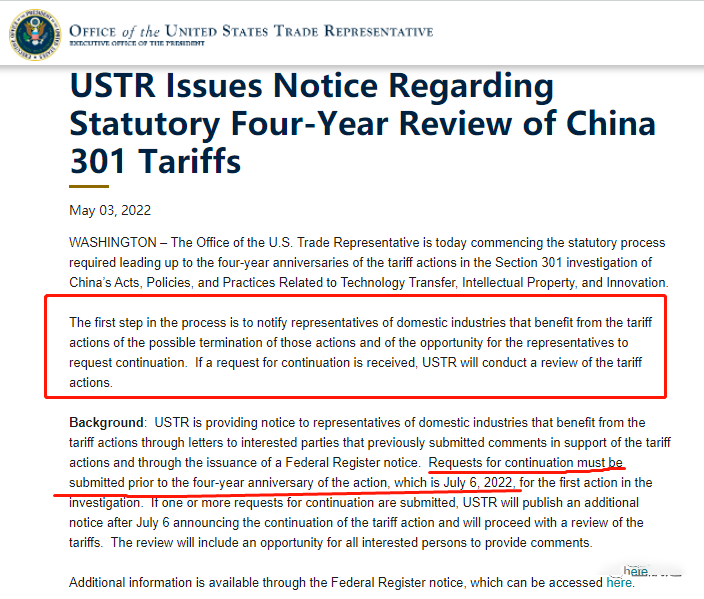 行业代表可分别在7月5日和8月22日之前向该办公室申请维持加征的关税。该办公室将依据申请对相关关税进行复审,复审期间将维持这些关税。