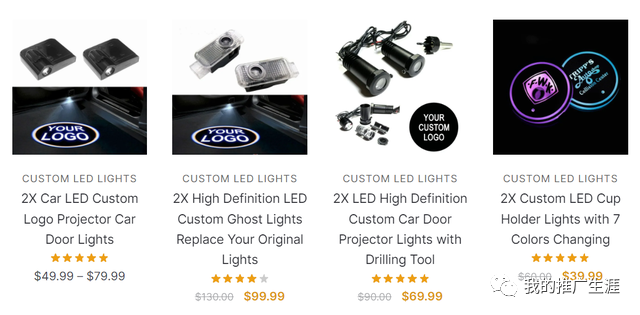 这个网站主要是卖车led灯的,主要是针对各种车型可以照射出定制的logo图案,产品的售价从几十美元到几百美元都有。