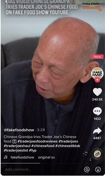 账号@fakefoodshow 推出系列视频——"我的中国祖父试吃乔氏超市(Trader Joe's)的中国美食"。视频中,爷爷亲自尝试每一种美国超市里的中国快餐产品,有时会被正宗的味道惊艳,有时也会对改版后的口味吐槽两句,场面有趣又温馨。这类测评视频帮助海外朋友们更多的了解中国美食,对中华味道的印象更加"接地气"。