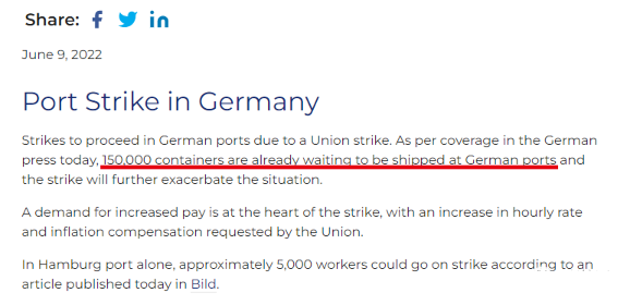 据悉,德国服务行业工会Verdi此前已呼吁各个海港的成千上万工人2022年6月9日进行罢工。根据外媒消息,仅在汉堡港,就有大约5,000名工人罢工。In Hamburg port alone, approximately 5,000 workerscould go on strike according to an article published today in Bild.8日,工会在汉堡宣布:若干港口的夜班工人将受到影响,包括德国最大港口汉堡。埃姆登、不来梅港和威廉港也计划举行数小时的罢工。