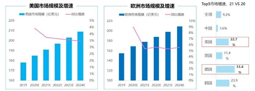 后疫情时代,兼具运动、休闲、社交等多重属性的户外运动需求增加。根据2020-2021间TOP5市场增速来看,美国以及德国市场应当重点关注。