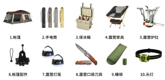 以去年的露营热销商品来看,排名靠前的产品有:帐篷、滤水器、野外生存装备、多功能洗澡更衣便捷帐篷、刀叉、灯具、户外桌椅、个人护理用品、户外冰桶、露营桌椅、遮阳用品、户外背包、露营炉具/配件、急救箱、露营毯、充气垫/泡沫垫、吊床、水壶、点火器等。