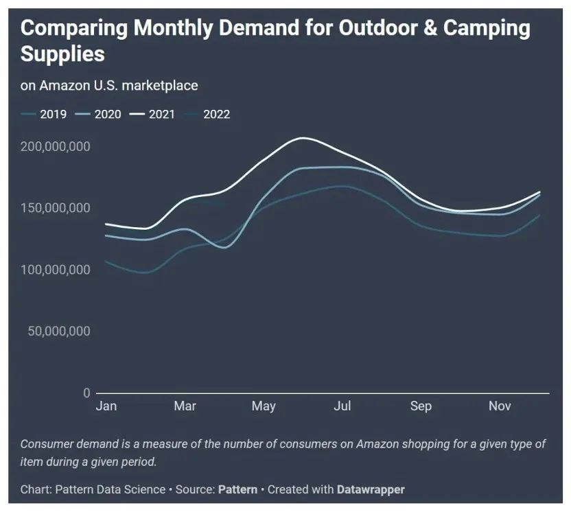 电子商务咨询公司Pattern的数据表明,2022年自年初起露营需求就非常强烈。根据Pattern关于亚马逊美国站的数据显示,今年1-4月,美国消费者对户外和露营用品的需求水平高于2020年和2019年,基本和2021年持平。美国消费者对户外和露营用品的需求在6-7月达到最高峰。