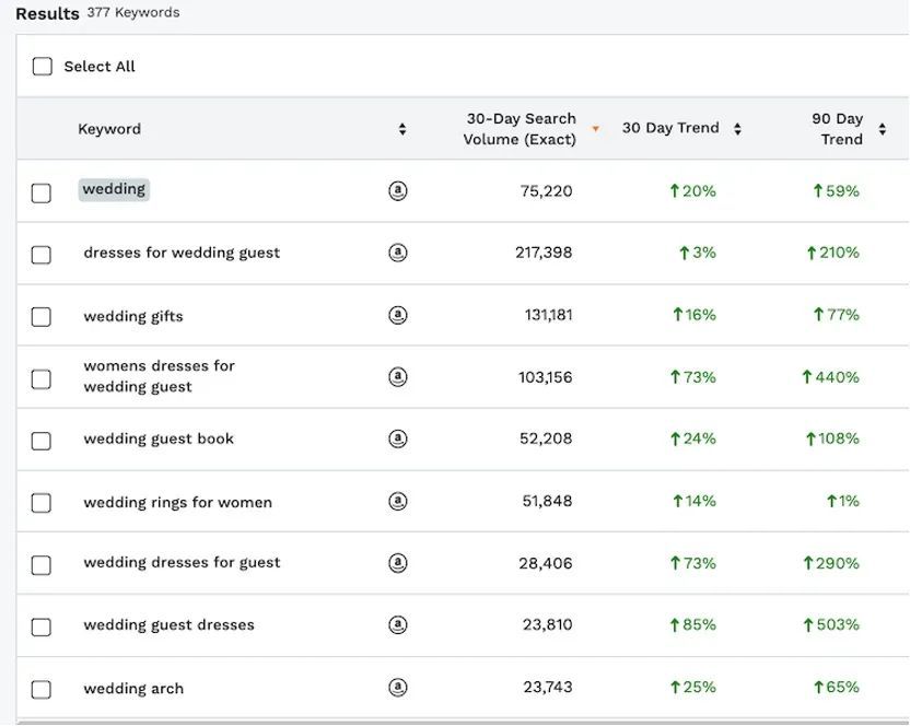 夏季和秋季是欧美婚礼和节日高峰季节,现在正是欧美消费者置办婚礼用品的最佳时期。Jungle Scout上的数据显示,所有以"wedding"为核心的关键词目前都呈上升趋势,并且每月搜索量都非常大。婚礼相关的关键词搜索量自今年3月下旬以来上升幅度尤为明显。