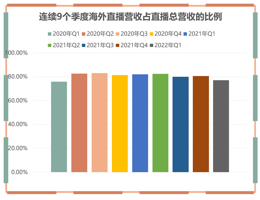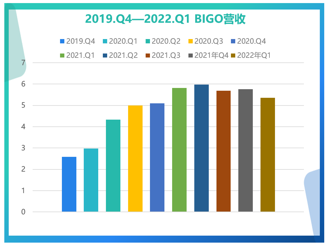 虽然,欢聚集团未在财报中分享具体的海外市场贡献占比,但结合 2021 年全年财报中提及的 Bigo Live 2022 年将"继续走全球化多市场均衡发展的道路,聚焦重点区域(北美、欧洲、日韩澳新、中东等)拓展,并加速对新兴市场的投入",以及 Bigo Live 和 Likee 两款产品在 Q1 的动作,中东应该是欢聚集团重要直播营收来源之一。从业务贡献来看,欢聚集团在财报中基本把业务划分为 BIGO 和其他。根据财报数据,2022 年 Q1 主要由 Bigo Live、Likee 和 imo 构成的 BIGO 业务贡献营收 5.35 亿美元,占集团总营收的85.7%。![]()