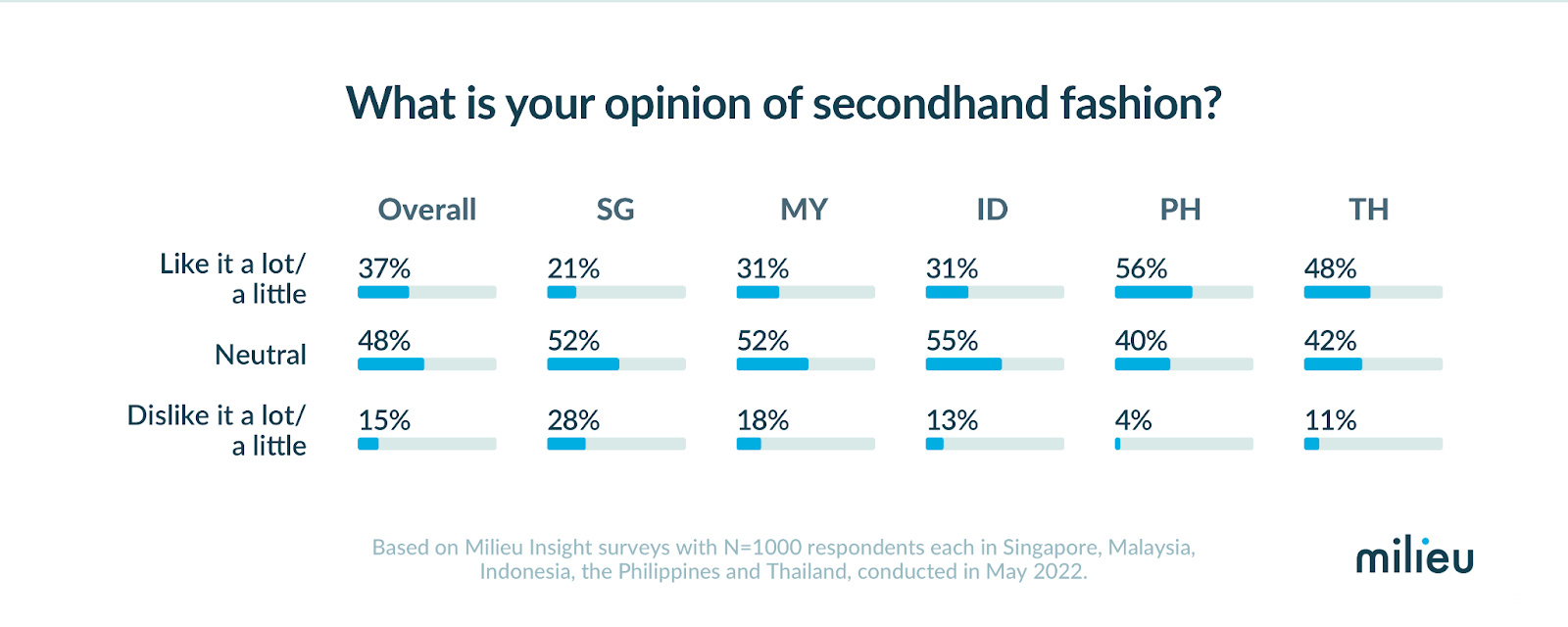 调查称,东南亚地区对二手服装的看法总体上是中性的(48%),持正面看法的比例达37%,负面为15%。新加坡消费者对二手时装持负面看法的比例最高,达28%。