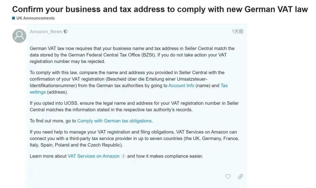 亚马逊德国站发布公告称为了遵守德国的增值税法,提醒卖家及时查看或更新卖家平台中的公司名称和税务地址与德国联邦中央税务局(BZSt) 存储的数据是否相匹配,以下是公告内容: