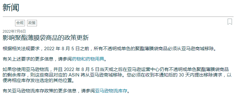 亚马逊美国站发布了一则《Policy update affecting Mylar bag listings》的公告:2022年8月5日之前,所有不透明或单色的聚酯薄膜袋必须从亚马逊商店下架,否则亚马逊将移除这些ASIN。
