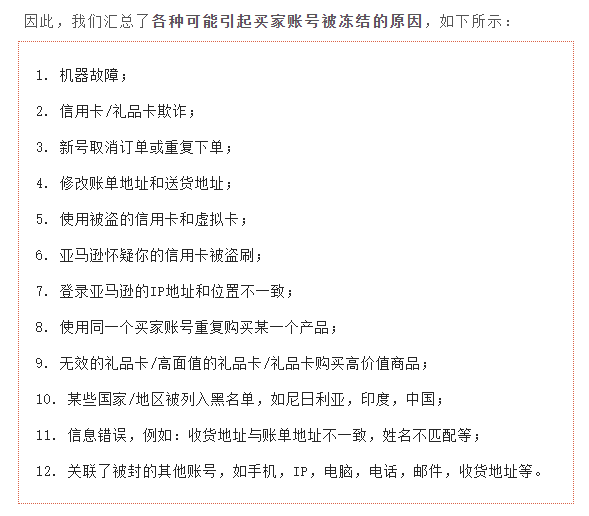 我们经过仔细了解,发现客户这次操作存在两个问题,一个是使用非本账号线上购买的礼品卡买东西,另一个是礼品卡购买了高价值的产品。在之前的文章《成功案例|亚马逊买家账号被冻结的原因及对策》中我们也提到过,一般引起买家号冻结的原因如下所示: