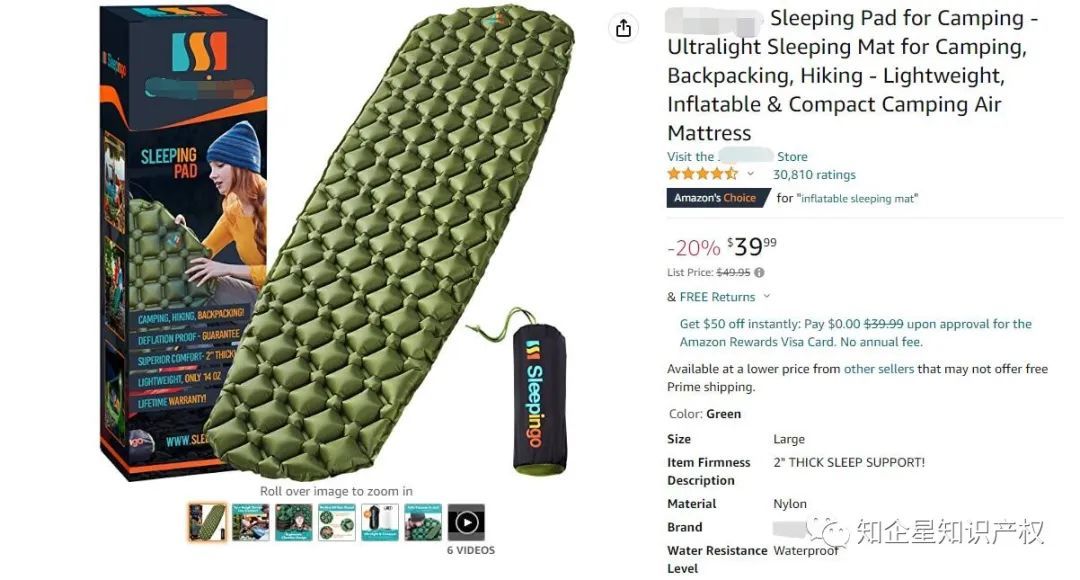 杜绝专利侵权风险,为您的产品保驾护航!今天分享一款充气式睡垫,它是美亚站的Amazon'sChoice,售价39.99美金,留评30847颗星。![]()