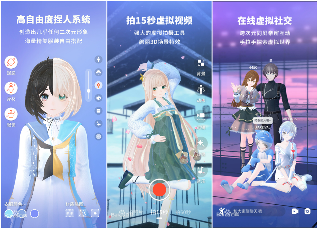 在波粒子推出的首款虚拟社交软件"Vyou 微你"中,用户可以通过 3D 捏脸换装功能,创建自己的虚拟形象,通过手机前置摄像头及麦克风捕捉面部表情及声音,并与虚拟世界中的好友进行合影等社交互动。
