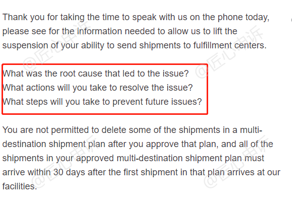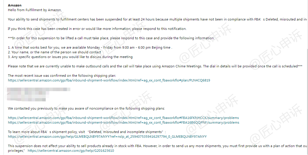 6月22日,我们收到一位客户的求助,他们的FBA发货权限暂时被冻结,起因是违反了"multiple shipments have not been in compliance with FBA's Deleted, misrouted and incomplete shipments policy",通知如下所示: