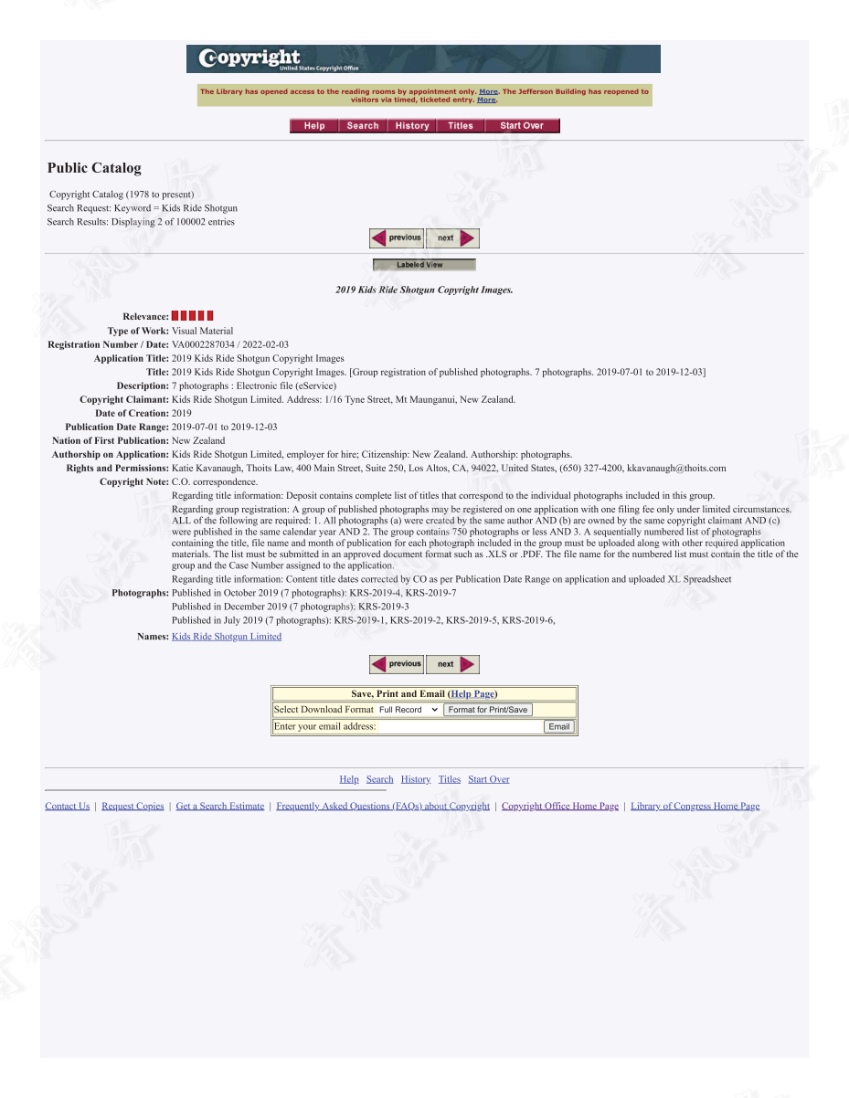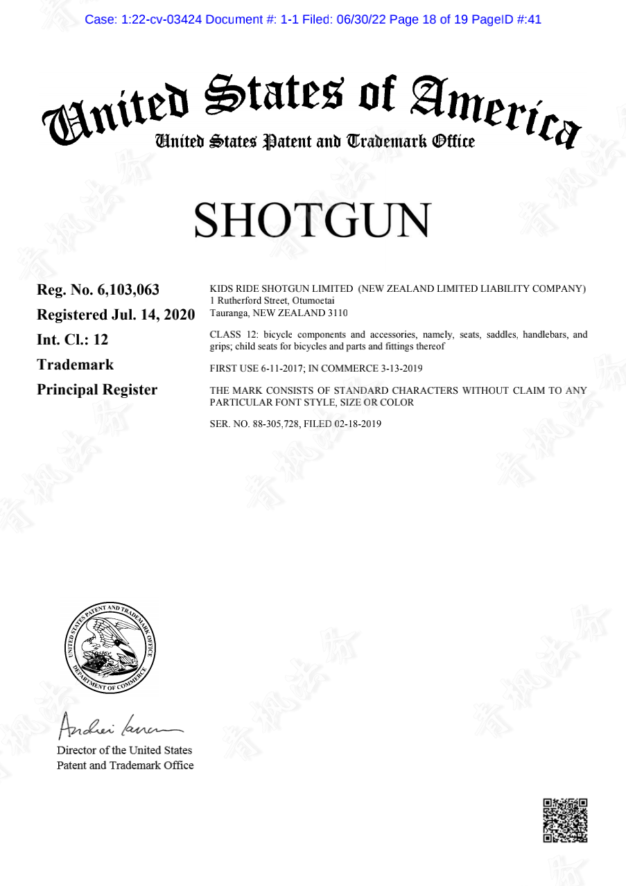起诉时间:2022年6月30日案件号:22-cv-3424代理律所:THOITS LAW受理法院:美国伊利诺伊州北区法院原告公司:Kids Ride Shotgun Limited原告官网: