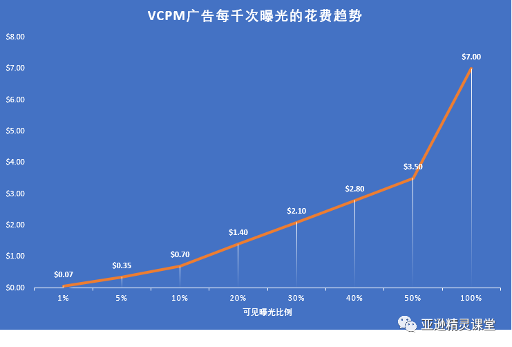 如果我们采用VCPM千次可见曝光付费广告,我们假设1000个曝光的可见曝光比例为20%,即1000个曝光带来的可见曝光为200,亚马逊对每1000个可见曝光的建议竞价为$7美元。那么这200个可见曝光的费用为 $7*20% = 1.4美金。
