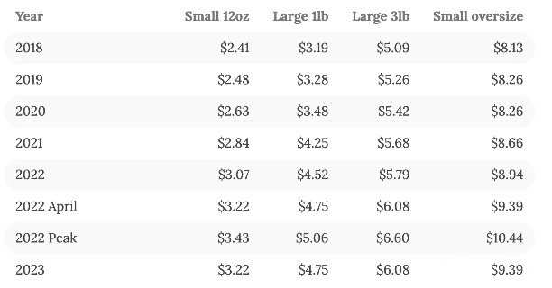 亚马逊配送费是逐步增加的,回顾其近年来的费用调整。2021年6月1日,亚马逊将配送1磅物品的费用提高了77美分。然后,在今年1月18日,费用增加了27美分。