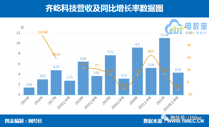 据齐屹科技半年报显示,截至2022年6月30日为止的总收入为人民币4.32亿元,同比减少17.6%。