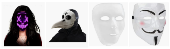 恐怖面具恐怖面具是万圣节cosplay的必备产品,有创意又能带来恐怖氛围的面具更易获得消费者的青睐,比如在多个平台热销的发光面具。