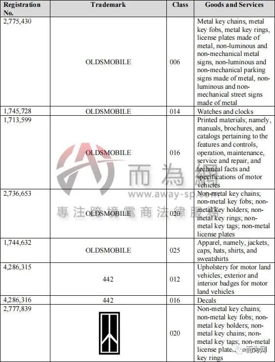 美国通用汽车,又一个品牌:OLDSMOBILE发起商标维权,这是美国通用汽车今年的第六个品牌发起维权,代理美国通用汽车维权案件的律所,是GBC律师事务所。