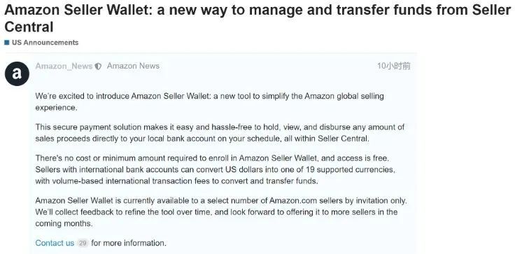 -亚马逊-亚马逊推出亚马逊卖家钱包亚马逊美国站发布公告称,亚马逊推出了亚马逊卖家钱包(Amazon Seller Wallet),为卖家提供简化简化亚马逊全球销售体验的新工具。这种安全的支付解决方案可让卖家轻松轻松地按日程安排将任何数量的销售收益直接持有、查看和转账到您当地的银行账户,所有的这些在卖家平台内都可完成。亚马逊卖家钱包目前仅受邀提供给部分卖家,注册亚马逊卖家钱包不需要任何费用或最低金额,并且免费访问。