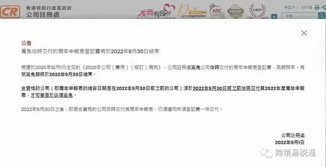 根据香港公司注册署最新消息,香港公司周年申报表的登记费豁免期将于2022年9月30日结束!即从10月1日开始,港府正常收取周年申报表的费用,届时年审费将会上调!所以,注册日期是9月的客户,请在9月内尽快办理年审!