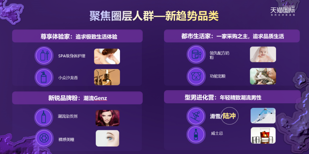 同时,基于对重点人群营销洞察的拆分,天猫国际找到了这些人群核心的购物场景和生活场景,以及下钻到新趋势品类的细分赛道。