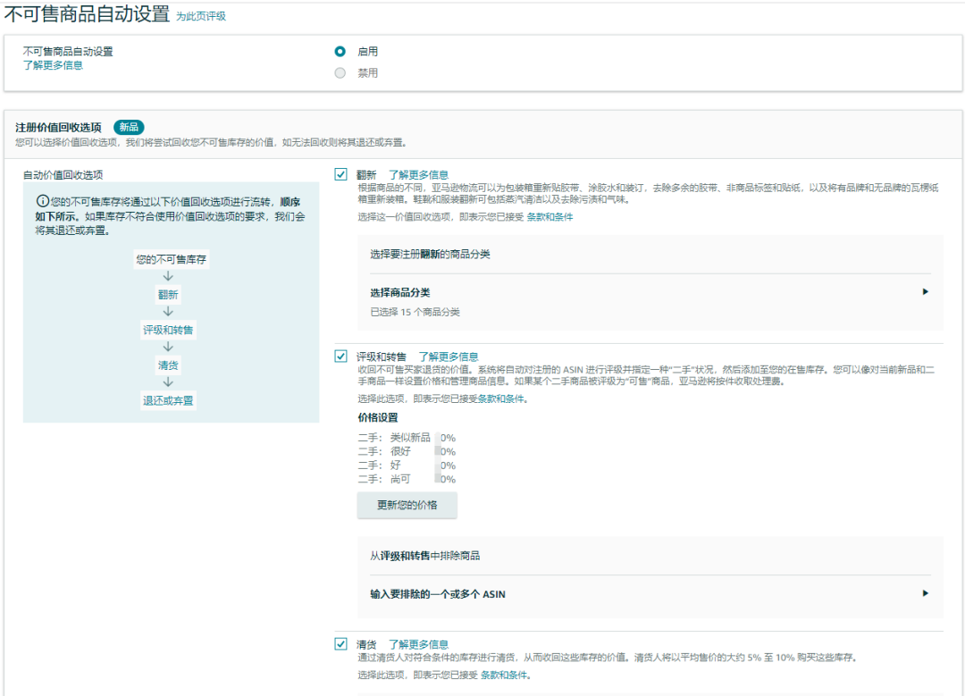 当您勾选了"翻新"、"评级和转售"和"清货"这些价值回收选项后,您的不可售库存将按照回收价值从大到小的顺序进行流转。如果库存不符合使用价值回收选项要求,亚马逊会再根据卖家设置的选项,将其退还和弃置。