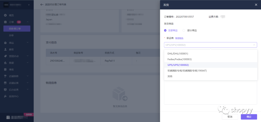 二、 安装应用并安装应用代码后,即可在商城后台对订单进行发货