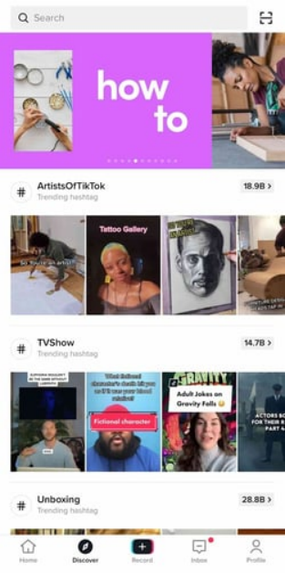 在此选项卡上,您可以滚动浏览流行的声音、主题标签和主题,并预览该类别中的热门视频。
