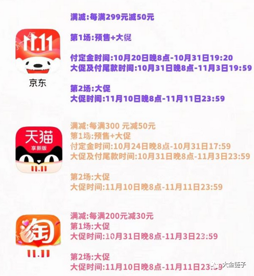 首先大金链子给各位看下国内购物平台京东、天猫、淘宝活动的安排: