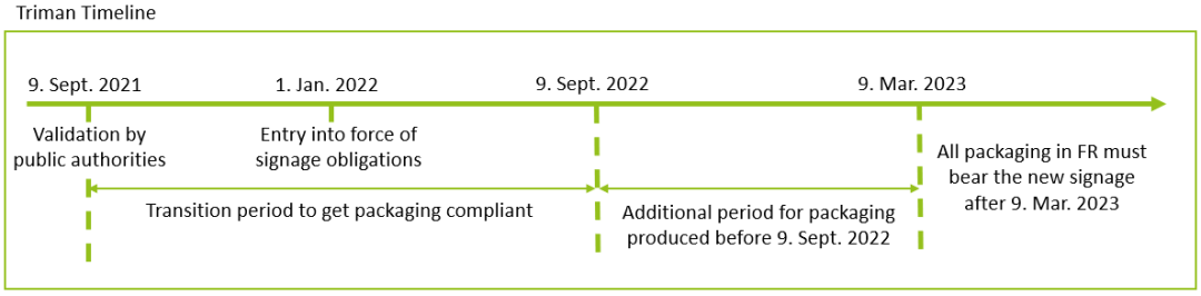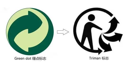 从2022年1月1日起,Triman标志已代替Green dot绿点标志。这个符号的主要原因是让消费者更容易理解如何对垃圾进行分类。带有Triman标志的产品和包装应收集在单独的废物中,例如纸张或可回收塑料。如果没有该符号,则可以将产品丢弃在一般废物中。