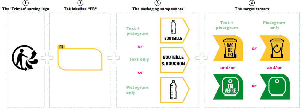 准确来说,法国包装法要求卖家印刷的Triman标志即为Triman标志logo和回收说明,两者共同构成包装材料回收标志,具体来说,Triman标志分四个部分,如下图:
