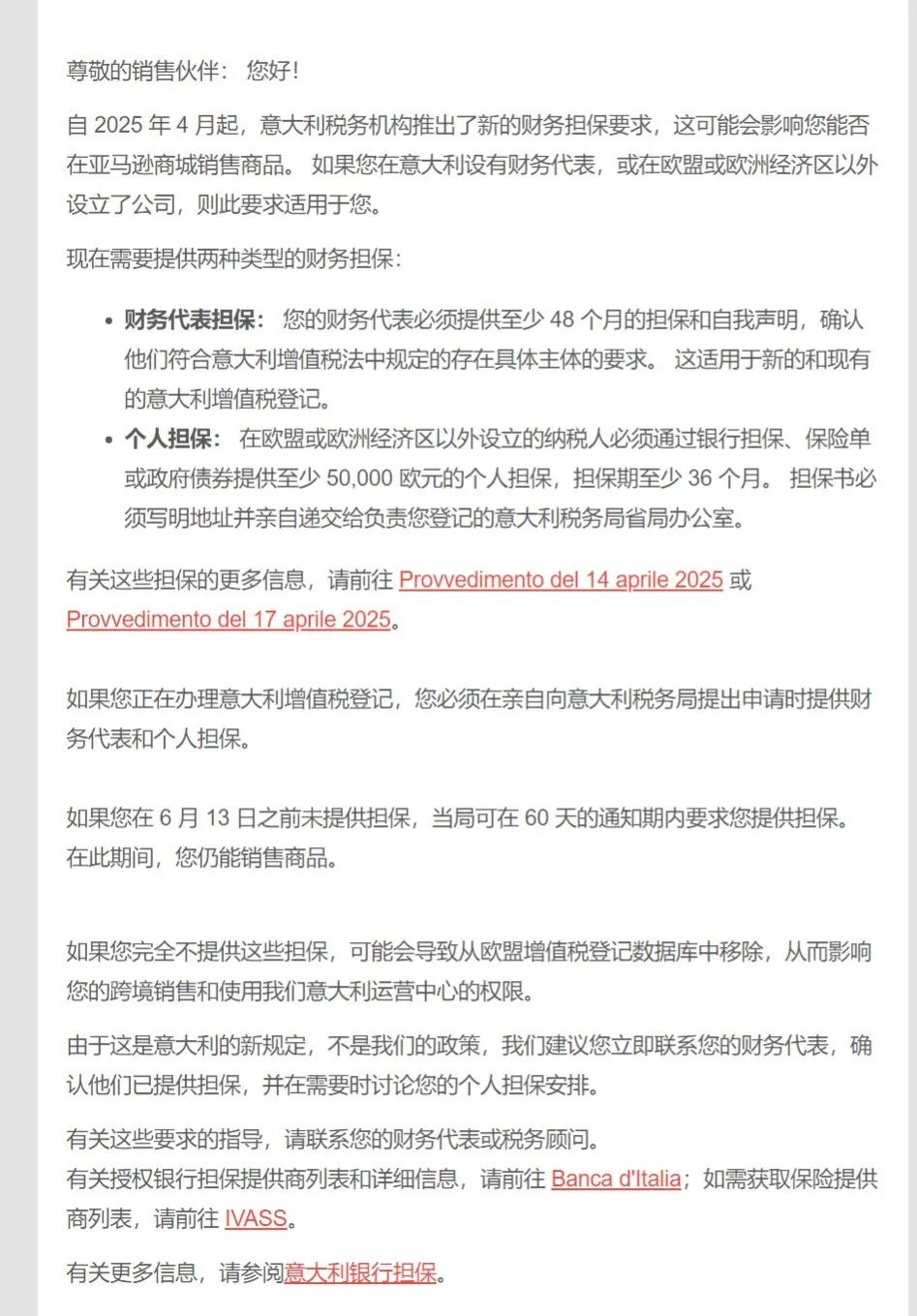 近日,亚马逊意大利站卖家收到重磅通知:非欧盟企业若想保留意大利欧盟税号(VIES 号),需在 6 月 13 日前缴纳 5 万欧元(约 40.7 万人民币)保证金,否则税号将失效。